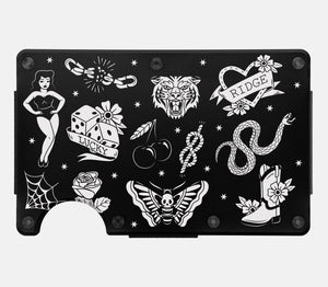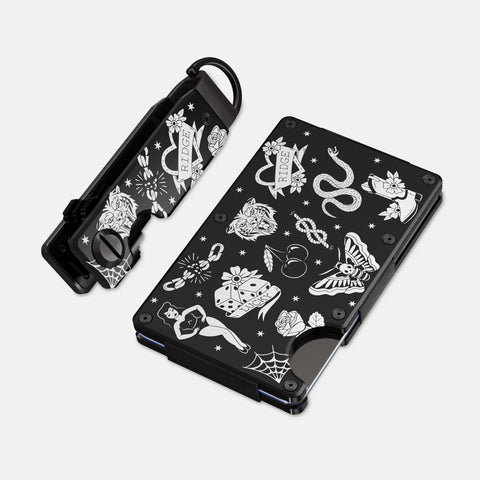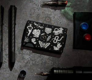 Each piece features iconic tattoo artwork precision-etched into military-grade materials, harkening back to the golden age of American tattooing.