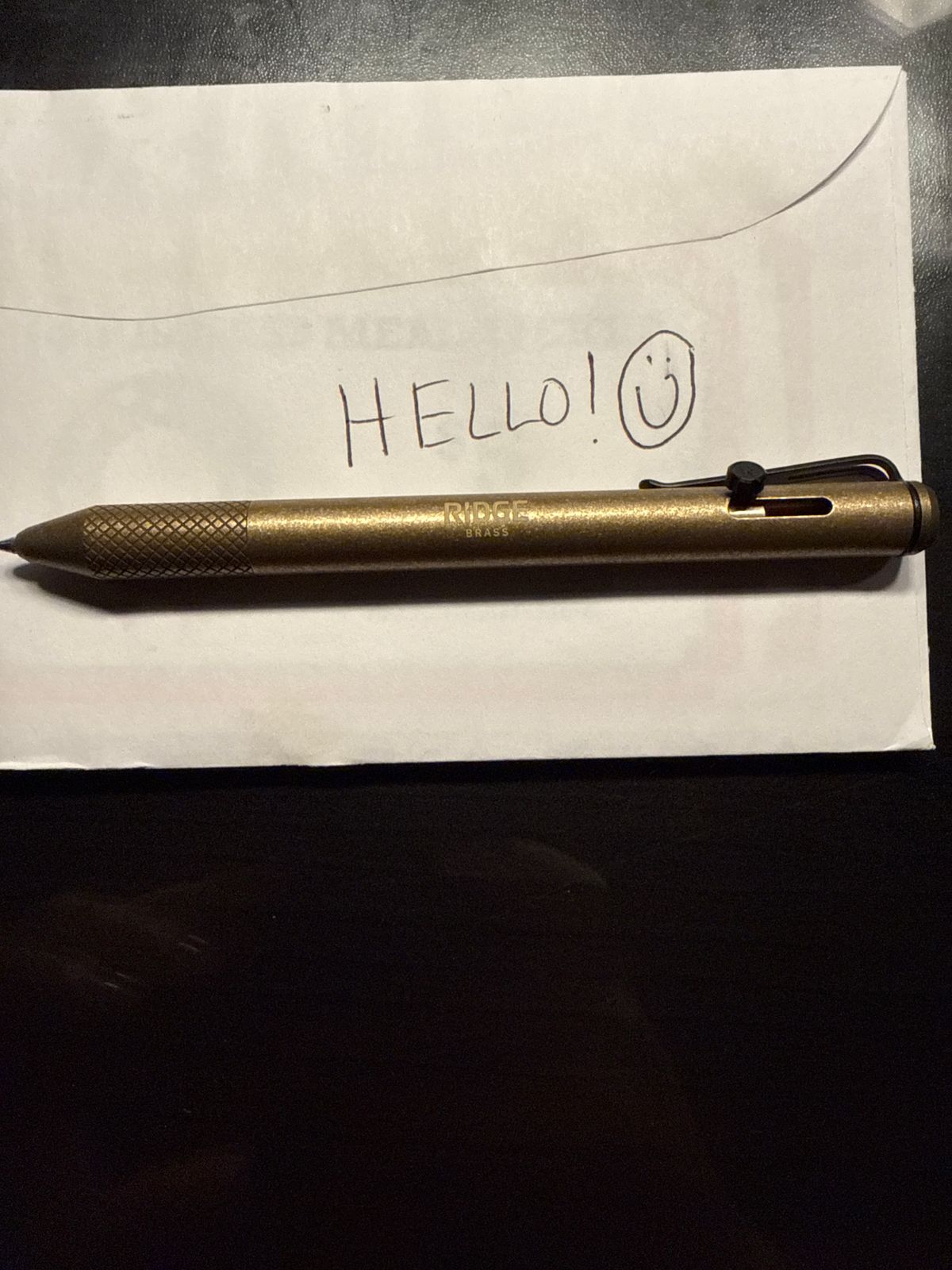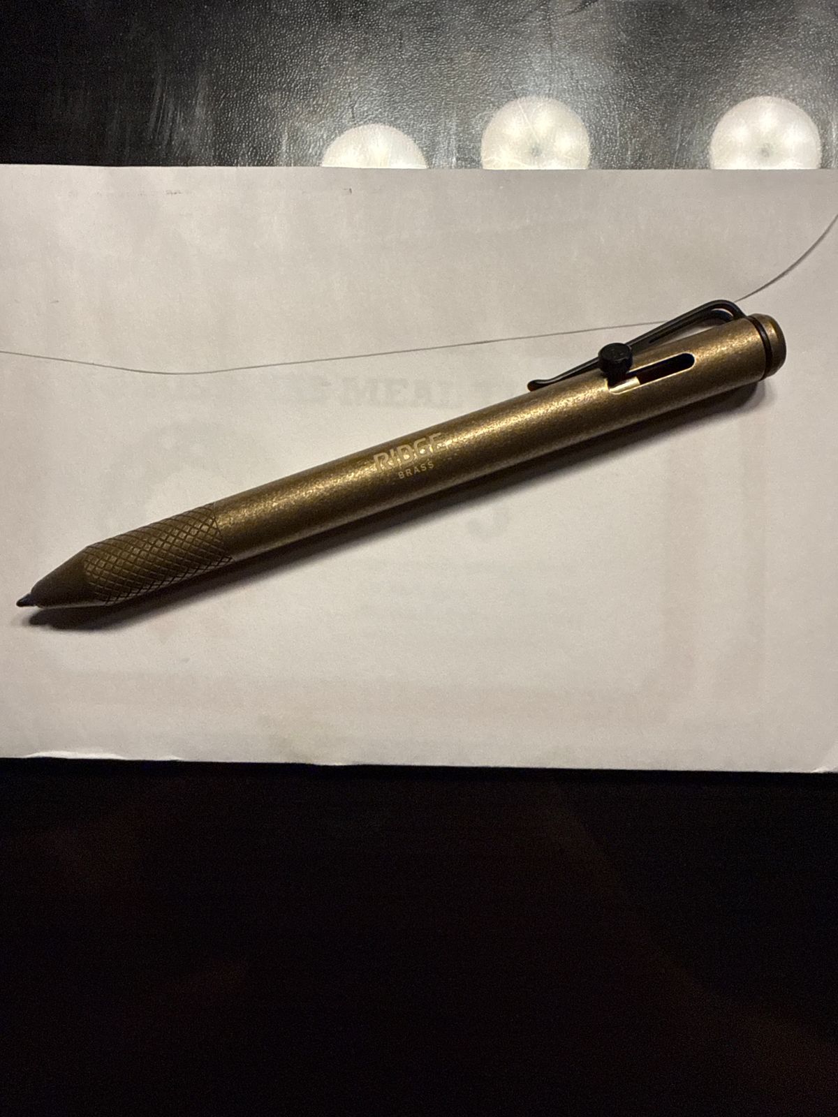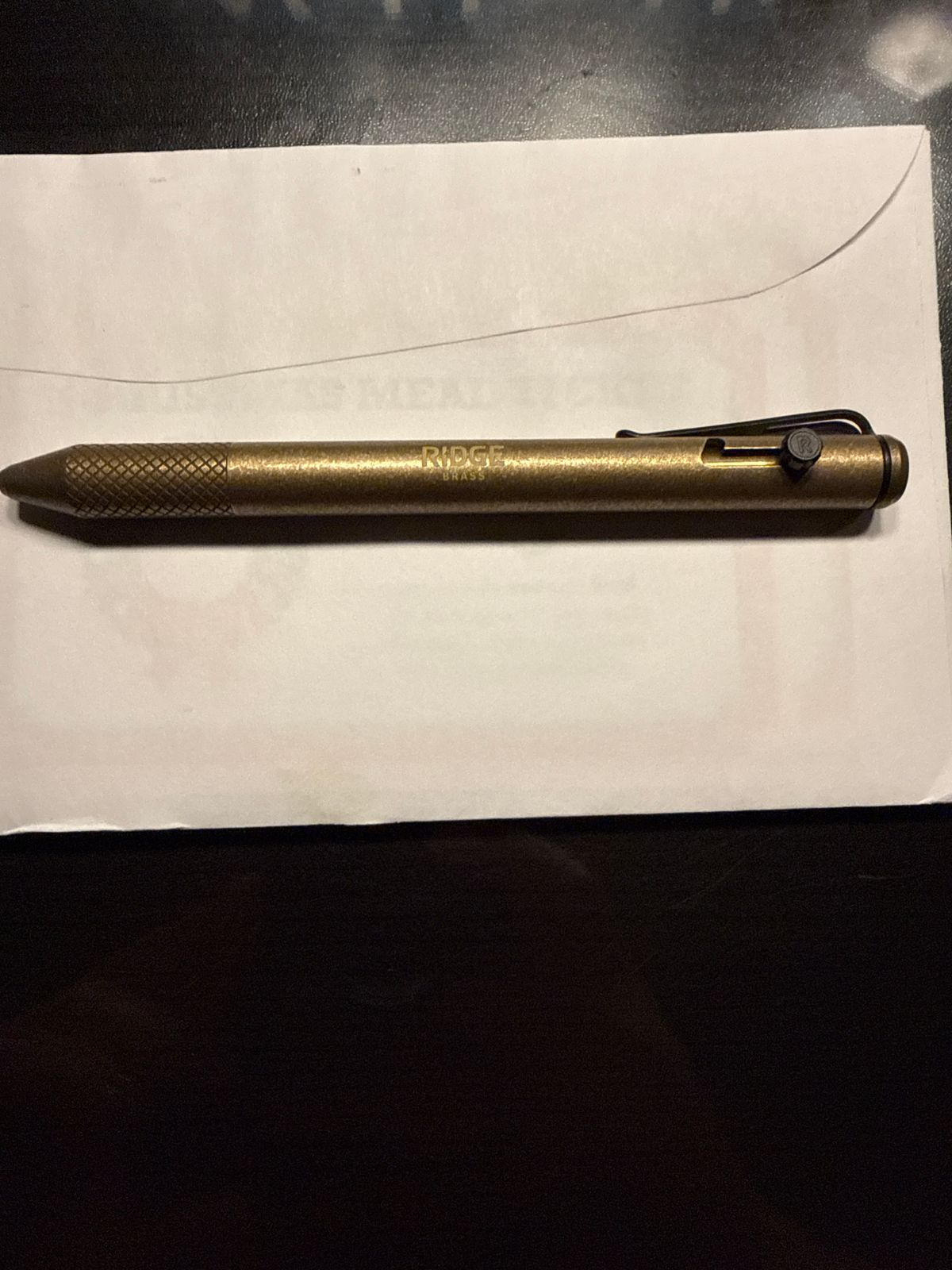 I received a free Ridge Brass pen with my order and I absolutely love it! I wish it would have been a matte black pen (to match my other matte black Ridge accessories), but I can’t complain! The brass actually looks so good and I love the slight heaviness the pen has. Doesn’t feel cheap at all and it writes great! Love the mechanism to open and close the pen. And the small clip is super convenient so I can carry my pen anywhere I go!